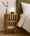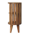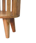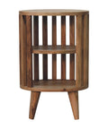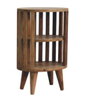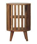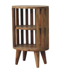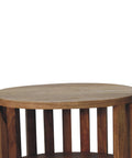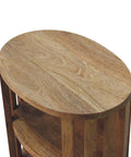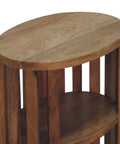 Tillverkat av massivt mangoträ med en varm ekliknande finish. Bordet har en elegant och smal design och två praktiska hyllplan.