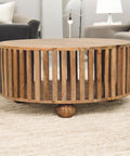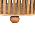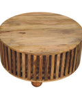 Runt soffbord med ribbade ben som ger bordet en luftig, öppen känsla. Bordet vilar på dekorativa, rundade träfötter som bidrar med både stabilitet och karaktär. Bordet är tillverkat av solitt mangoträ.